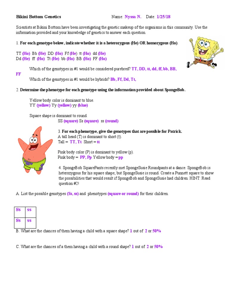 Use your knowledge of genetics to answer the questions below. Chickens can be stored in cages for future breeding, and the. Use the information provided and your knowledge of incomplete dominance to answer the following question. I rait bod sha e bod color l. One of spongebob's cousins, spongebillybob, recently met a cute squarepants gal, spongegerdy, at a local dance and fell in love. If you want to download the image of genetics worksheet answer key or spongebob genetics worksheet answers kidz activities, simply right click the image and choose save as. Purebred = tt, dd, ff 2. Punnett square worksheet 640 629 multiple alleles practice. Genetics worksheet answer key also spongebob genetics. Bb we tried to locate some good of genetics worksheet answer key or spongebob genetics worksheet answers kidz activities image to suit your needs. Some of the worksheets for this concept are genetic code work answer key, simple genetics answer key epub, spongebob genetics work answers, biology genetics work answers, genetic code work answer key epub, km 754e 20160113072528, , human pedigree genetics work answers. Spongebob genetics answer key / spongebob genetics answer key 3 + my pdf collection 2021 : Use the information for spongebob's traits to write the phenotype (physical appearance) for each item.